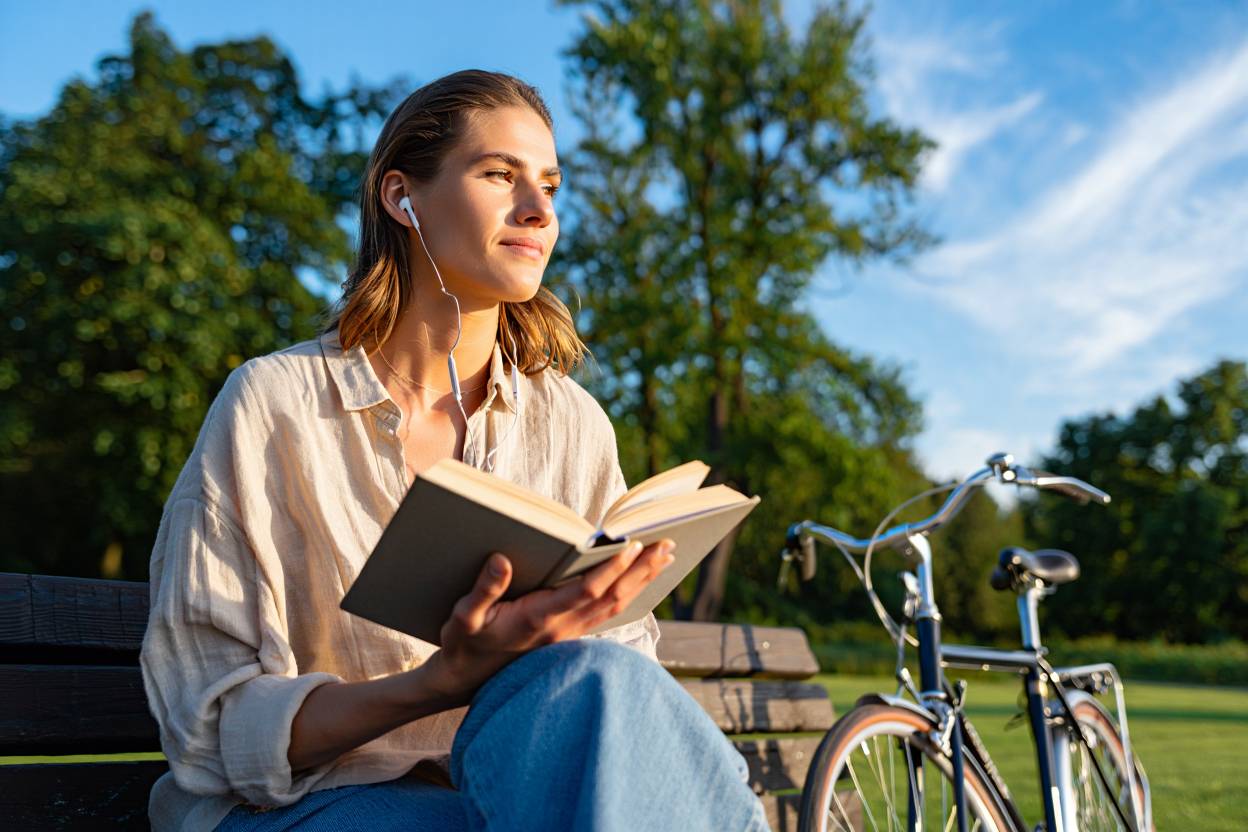 Девушка сидит на скамейке и читает